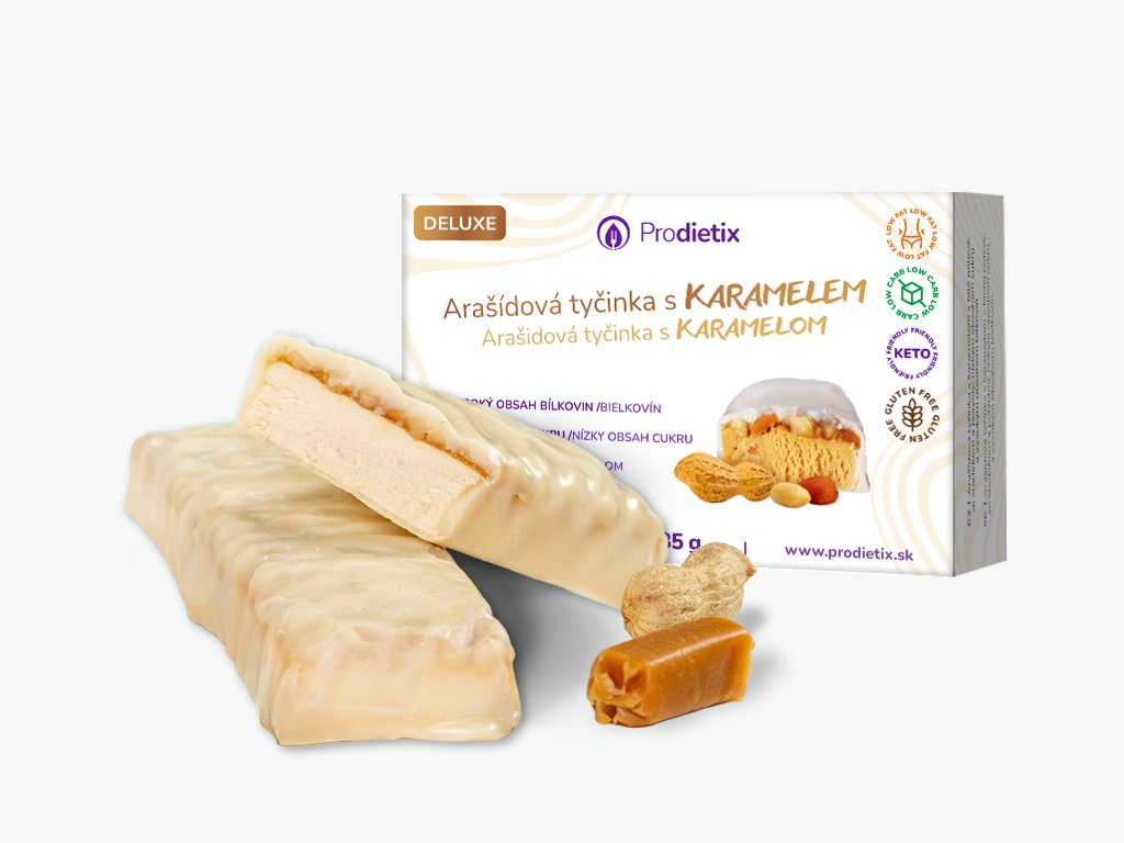 Arašídová tyčinka s karamelem v bílé polevě, se sladidlem a polyoly, nízkým obsahem cukru a vysokým obsahem bílkovin.