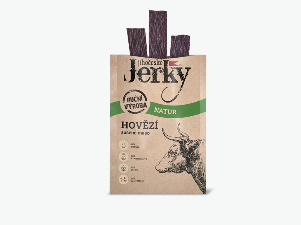Hovězí jerky natur je sušené a jemně zauzené maso vyrobené ze 100% hovězí svaloviny z českých chovů, kde hraje hlavní roli kvalita suroviny a poctivé zpracování. Díky šetrnému sušení si zachovává intenzivní chuť, pevnou texturu a mimořádně vysoký obsah bílkovin.
