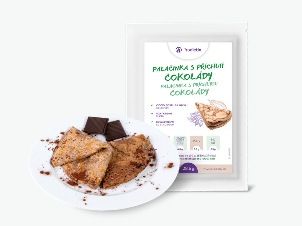 Pro milovníky čokoládových snídaní je palačinka s čokoládovou příchutí jako stvořená. Pro svou jednoduchou přípravu se hodí také jako Snídaně;Svačina ve všech fázích proteinové (keto) diety, nebo jako doplněk běžné stravy pro snadnější udržení optimální váhy. Obsahem sáčku je vysokoproteinová směs pro přípravu palačinky s čokoládovou příchutí se sladidly, sníženým obsahem cukrů a tuků.