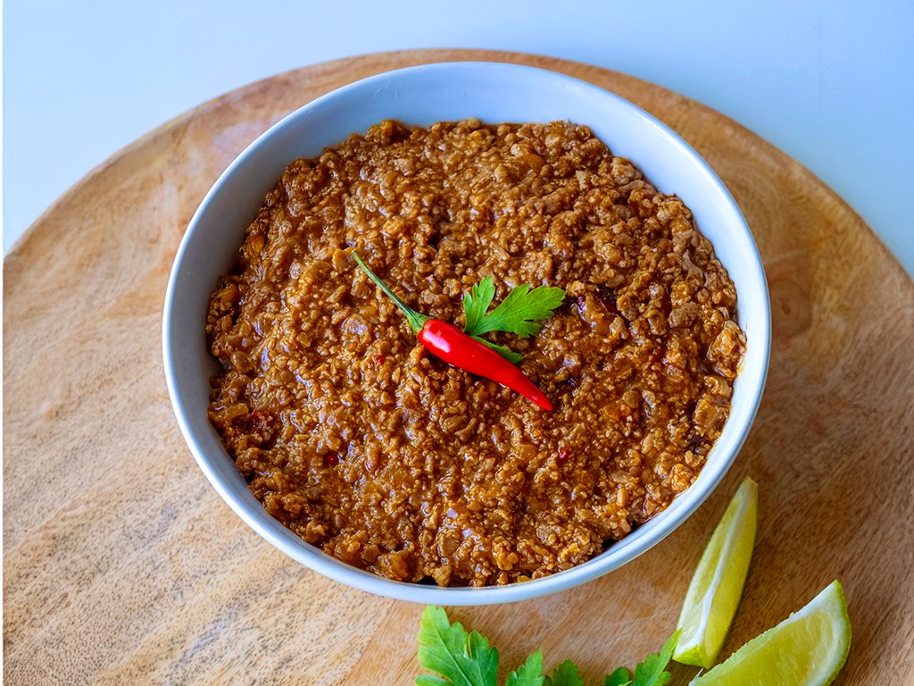 červené fazole, sójový protein, čekankový inulin, hrachový protein, koření (opečená cibule, paprika, kmín, chilli, česnekový prášek, oregano), rajčatový prášek, sůl, cibule, zahušťovadla: xanthanová a guarová guma, aromata (obsahuje ječmen), triglyceridy se středně dlouhým řetězcem, červená paprika, kyselina citronová, prášek z červené řepy, vitamíny* (C, E, B9, B3, A, B5, B8, B12, B6, B1, B2), antioxidant: rozmarýnový extrakt