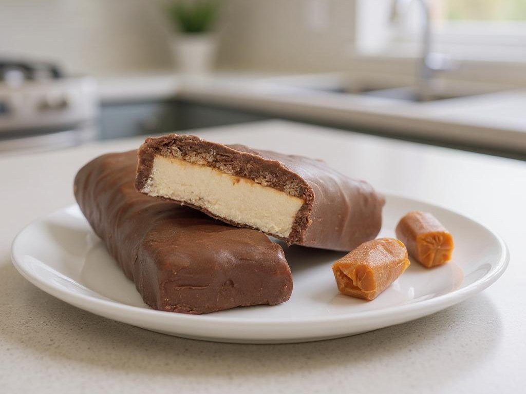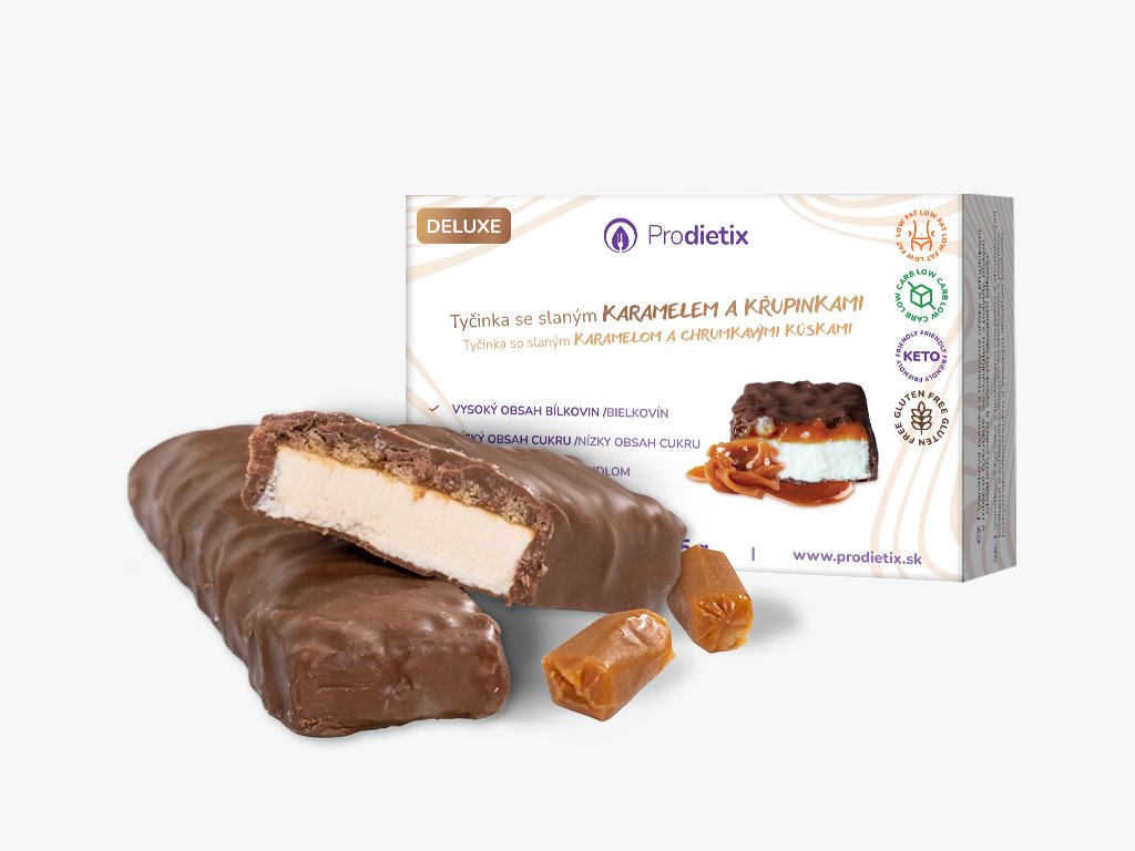 Tyčinka so slaným karamelom a chrumkavými kúskami v mliečnej čokoláde. So sladidlom, s vysokým obsahom bielkovín a nízkym obsahom cukru.